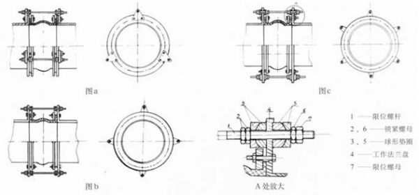 當(dāng)橡膠接頭需承受較高壓力,軸向或徑向位移范圍有可能超出允許值時(shí),或用戶對(duì)橡膠接頭的位移性能有特殊要求時(shí),均可采用限位裝置。 限位裝置的形式有三種 A型—限位螺桿緊固在管道法蘭盤上(見圖a) B型—限位螺桿焊接在管道法蘭